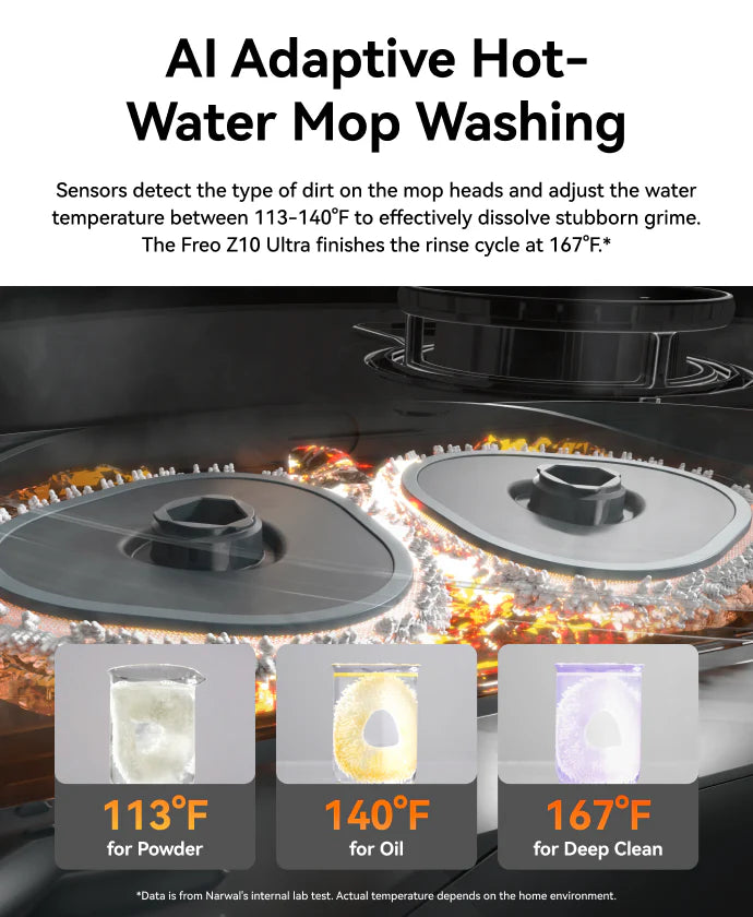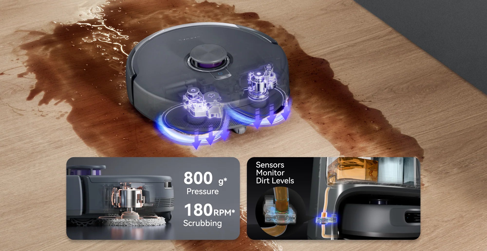 Dual mops mimic hand-scrubbing to tackle tough stains like old ketchup and coffee. The Dirt Sensor detects dirt level and mops until clean.*