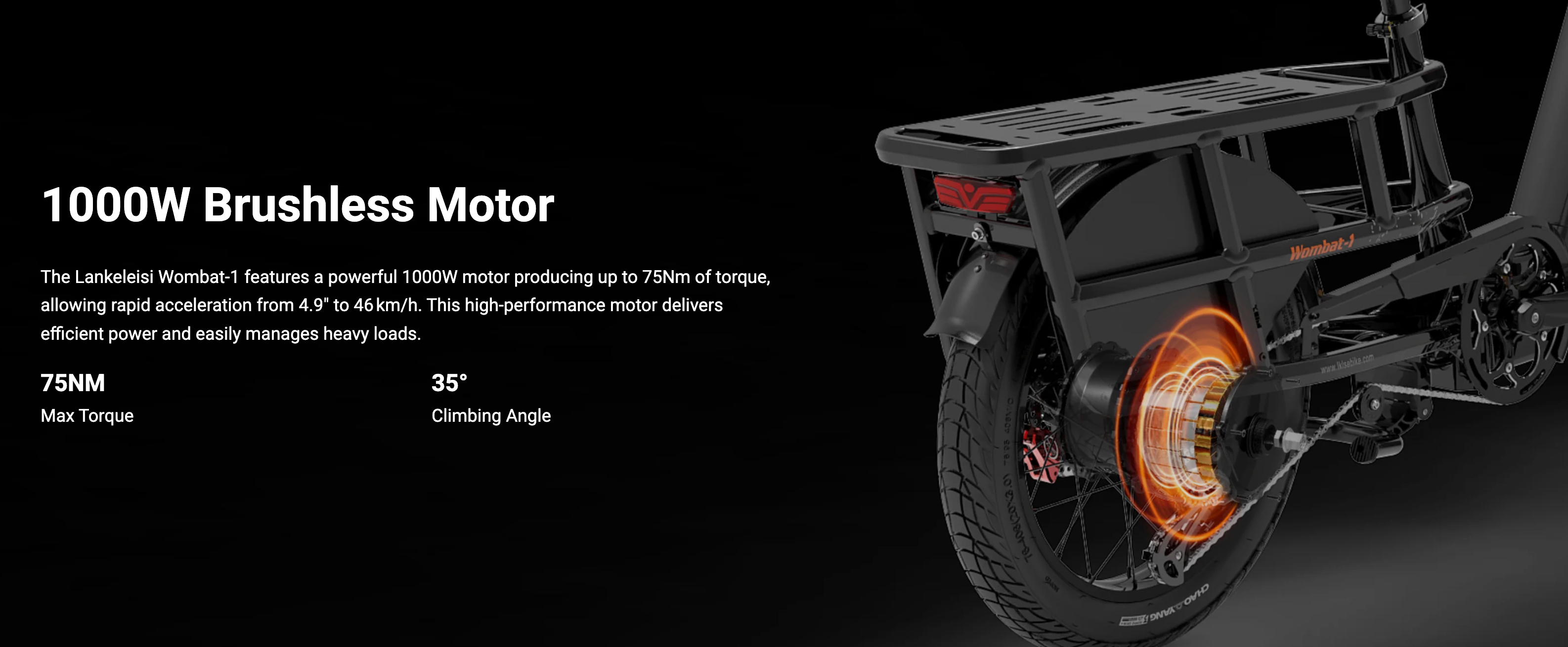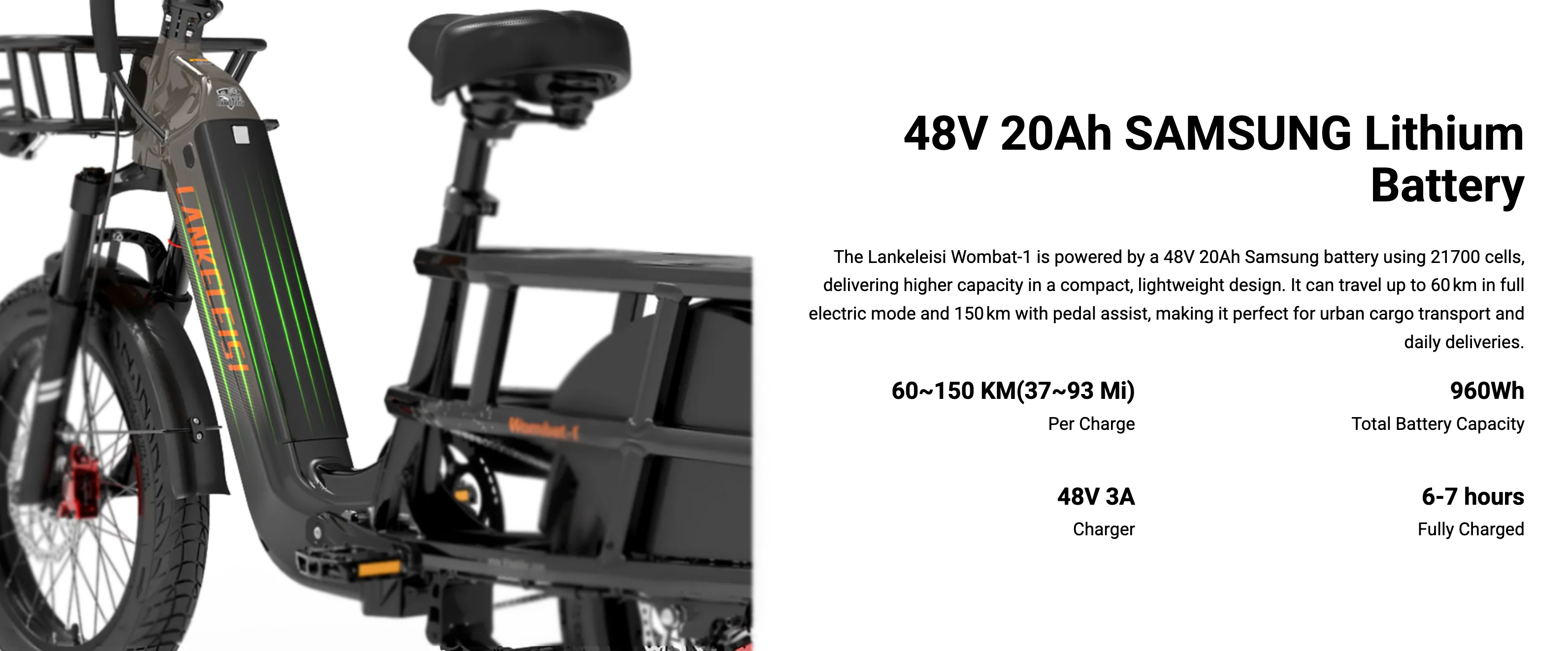 Transform your daily commute and hauling tasks with the Lankeleisi Wombat-1. Built for versatility and power, this heavy-duty cargo e-bike features a robust 1000W brushless motor and a long-range Samsung 48V 20Ah battery. Whether you are delivering packages, carrying groceries, or taking a long-distance adventure, the Wombat-1 delivers stable performance, exceptional range, and the ability to carry up to 440 lbs.